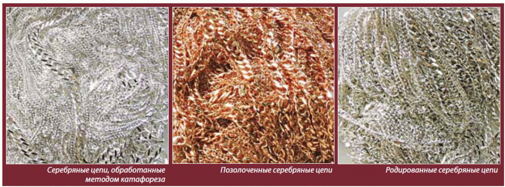 Применяя технику катафореза, создающего барьер окислительным процессам на длительное время, на ЮЗ «Адамант» получают очень красивые цепи с особенным декоративным покрытием. В отличие от многих мировых производителей «Адамант» делает катафорез для своих клиентов абсолютно бесплатно.