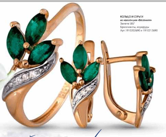 Ценители ювелирного искусства заслуженно отводят изумруду особое место в перечне драгоценных камней. Прозрачный, травянисто-зеленый, это один из самых дорогих ювелирных камней. До недавнего времени украшения с изумрудом были привилегией лишь состоятельных людей. Но сегодня «Алмаз-Холдинг» делает роскошь доступной для своих клиентов, представляя новую коллекцию легковесных изделий по бюджетной цене. Любое украшение — будь то серьги или изящное кольцо—украсит прекрасных дам. Более весеннее украшения сложно себе представить: словно золотые лучи солнца играют с изумрудной листвой... И в этом заключена особая прелесть и выразительность.