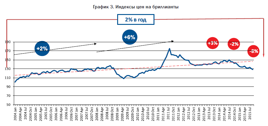 ■ цена на бриллианты подвержена небольшим колебаниям, но в долгосрочной перспективе показывает рост.