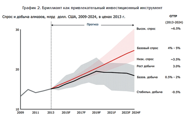 Какими бы большими ни казались эти цифры, в последние несколько лет наблюдается падение добычи алмазного сырья. И это оказывает позитивное влияние на поддержку цен на бриллианты. Даже если в ближайшее время будут открыты новые месторождения (чего за последние десятилетия почти не случалось), стоимость их разработки (производственные расходы по запуску месторождения и добыче алмазов) будет достаточно высокой. Кроме того, спрос на алмазы выше, чем их предложение на мировом рынке. Соотношение добычи и спроса на алмазы показано на графике 2.