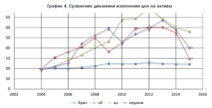 Что касается цен на бриллианты, их динамика отражена на графике 3, а сравнение изменения динамики цен на основные активы представлено на графике 4.