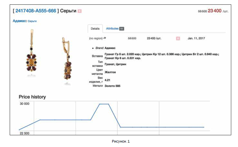 Словарь терминов данной статьи:1) розница - наличие реальных физических магазинов, куда можно прийти и выбрать товар, лично подержать в руках; 2) онлайн-игроки - интернет-магазины, где можно: а) выбрать и изучить изделие, рассматривая картинку и описание; б) купить товар; в) заказать доставку в ближайший магазин; г) позвонить и получить консультации, посоветоваться; 3) SKU - единица измерения, товарная единица, 1 штука, обладающая такими свойствами: товар (SKU) может принадлежать к разным товарным категориям, одному SKU соответствует несколько разных атрибутов. Проще говоря, это конкретное изделие, которое можно посмотреть в интернет-магазине или подержать в руках в розничном магазине; 4) тип вставки и другие товарные свойства - свойство товара, имеющее фиксированный набор заранее оговоренных значений, например, атрибут «цвет металла» содержит 5 уникальных и заранее оговоренных значений, таких как: белое, красное, желтое, без цвета, черное (пример значений атрибутов - рисунок ) 5) серьги-пусеты - популярная товарная подкатегория: это серьги, которые крепятся к мочке уха при помощи штифта («гвоздика»), удерживаемого зажимом; 6) история цен - регулярно собираемые значения цен на одну SKU. Цены на товар могут день ото дня меняться или не меняться. Для того чтобы знать, когда и на сколько изменилась цена, мы сохраняем цены на каждый товар еженедельно вне зависимости от того, менялась она или нет. Основные онлайн-игроки рынка ювелирных изделий меняют цены в среднем раз в 1-1,5 недели, поэтому эффективный интервал срезов, которые мы предлагаем, -раз в неделю; 7) глубина ассортимента - кол-во товаров внутри какого-то среза/сегмента. Например, кол-во товаров внутри ценового диапазона; 8) драгоценный камень (ДК) - камень, используемый во вставках в SKU. К ним относятся алмазы, изумруды, рубины, сапфиры и александриты. Есть также полудрагоценные камни, список которых существенно больше.