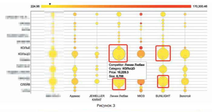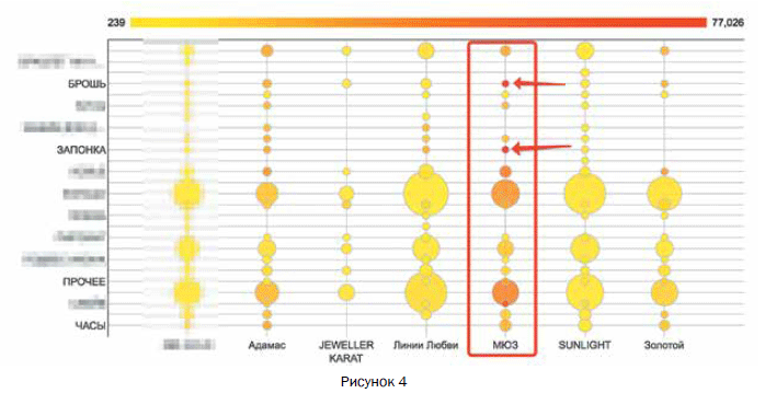 Как читать график: в строках - категории, в столбцах - значения (количество и средняя цена). Пересечение, скажем, «Кольцо» vs Sunlight дает окружность желтого цвета. Чем желтее/краснее, тем средняя цена ниже/ выше; диаметр окружности показывает количество товаров в этой категории.
