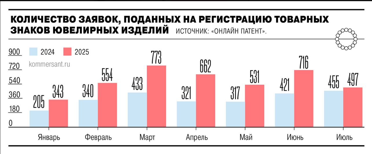 Общий рост российского ювелирного рынка может стимулировать локальные компании регистрировать товарные знаки активнее. По данным Росстата, в 2024 году в РФ было продано ювелирных изделий на 563 млрд руб. Это почти на 30% превышает показатель 2023 года. В первом квартале 2025 года объем реализации таких изделий составил 157,8 млрд руб.— на 34% больше год к году.